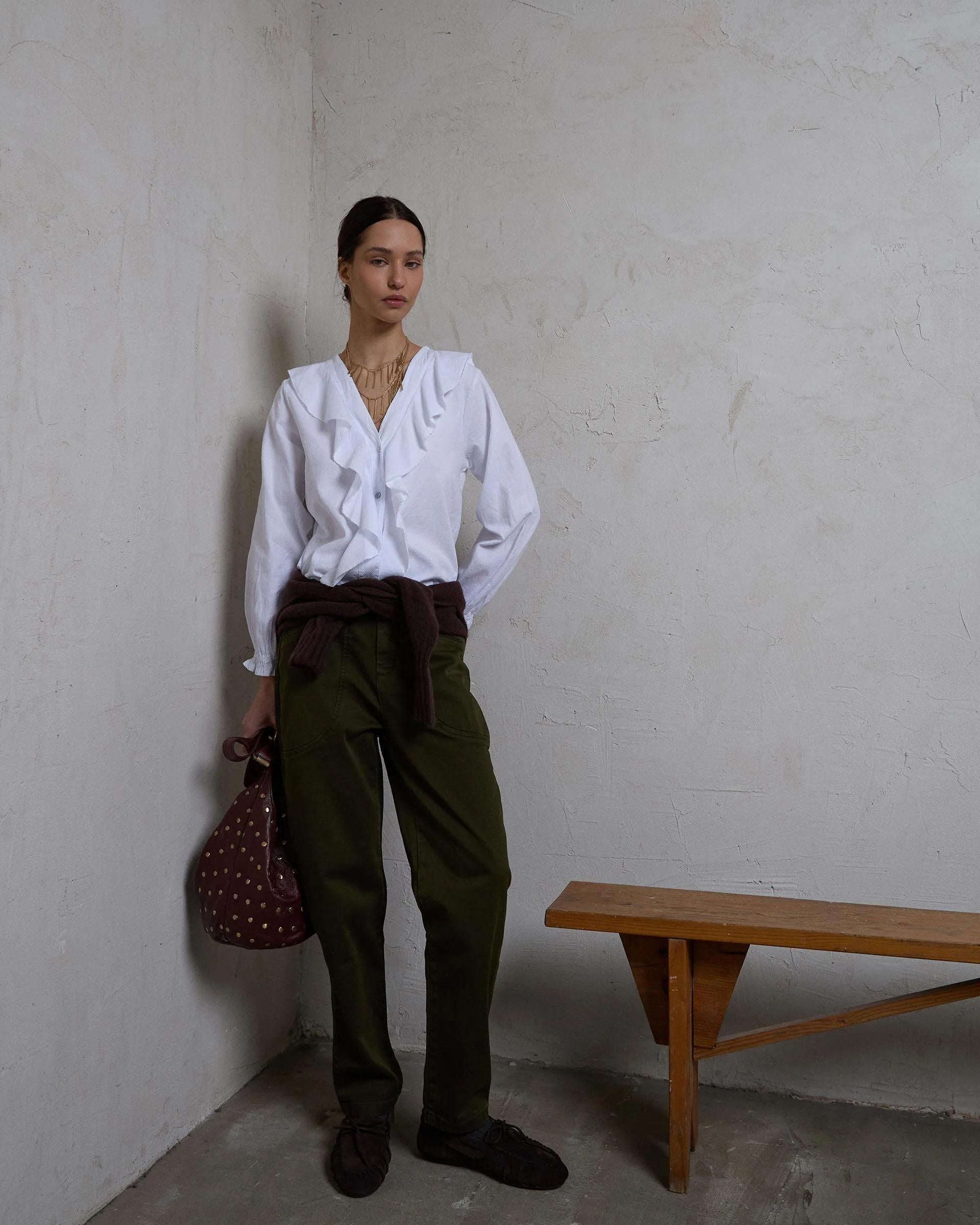 Blusa de manga larga de color blanco con cuello en pico, volantes en parte central y sutil en puño.