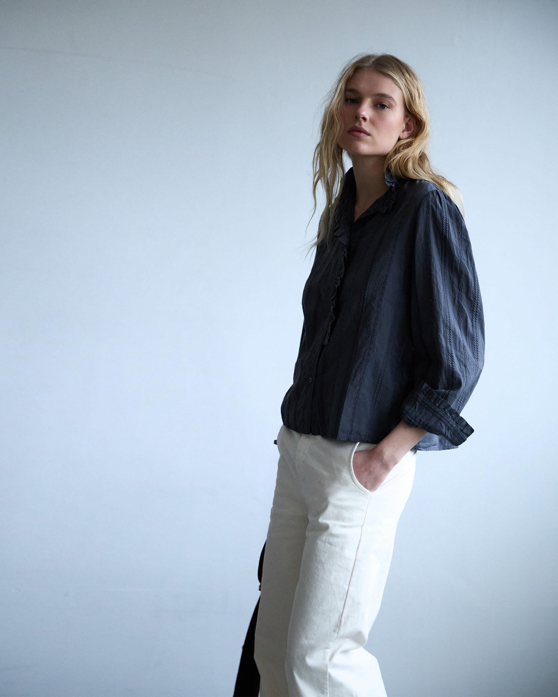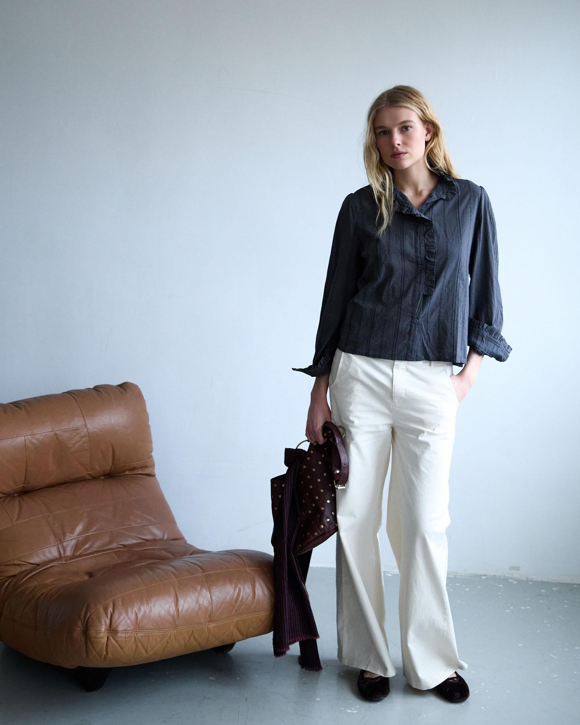 Blusa de manga larga con detalle de troquelado y volante, en color gris.