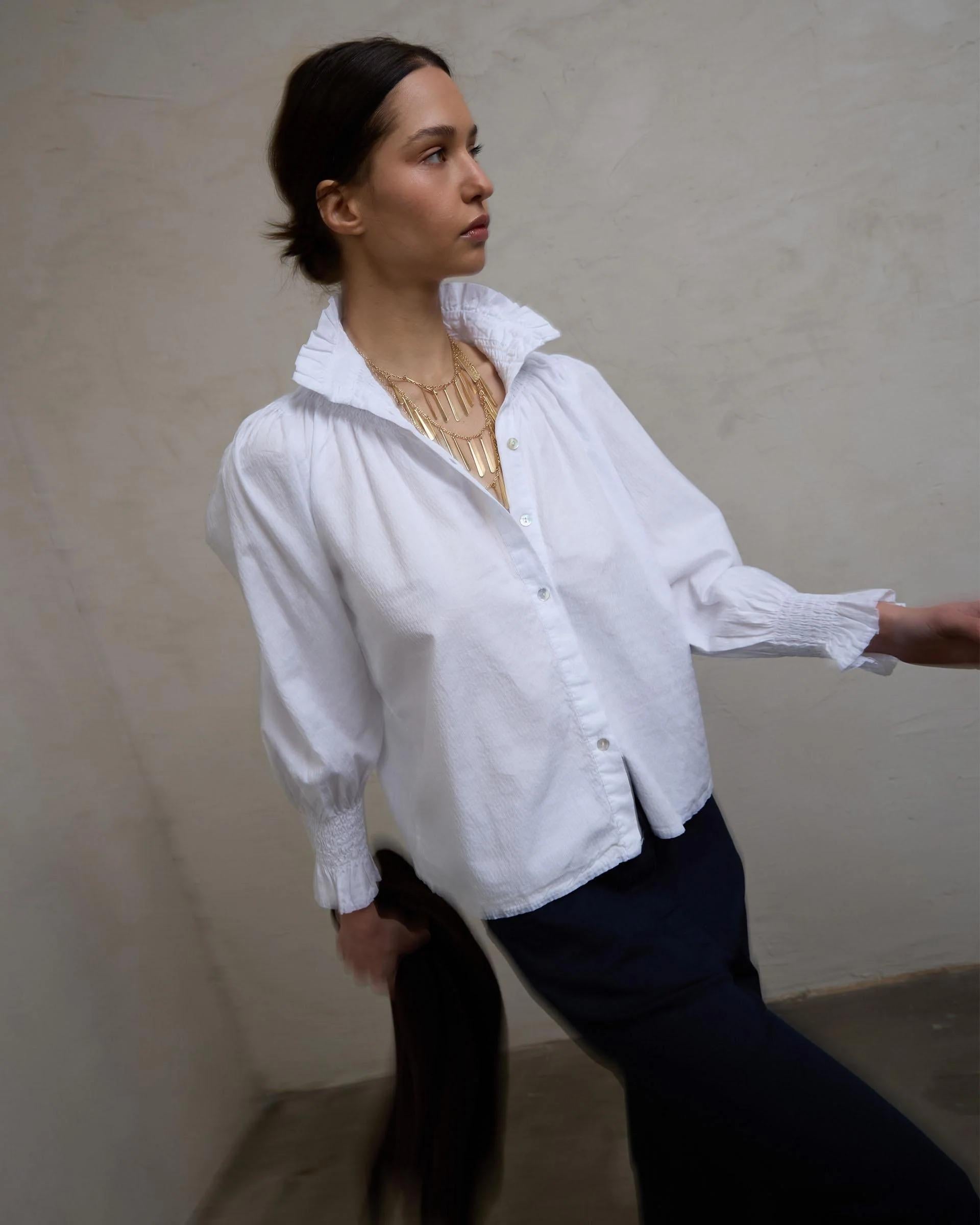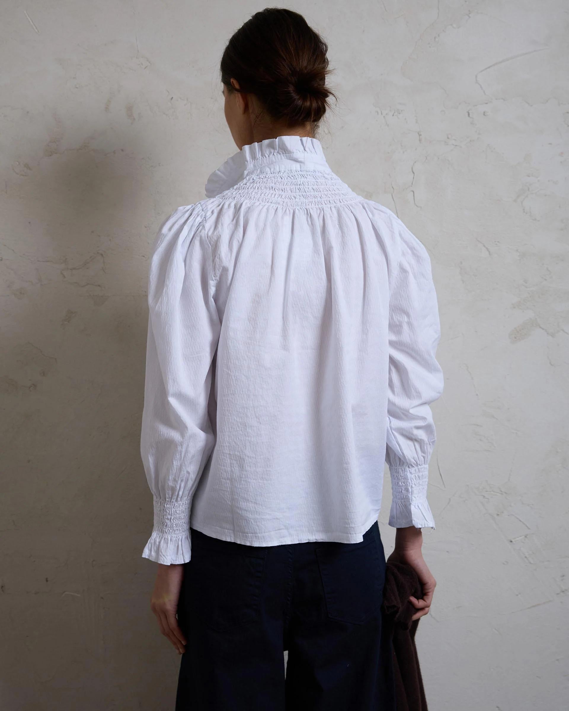 Blusa de color blanco con detalle de nido de abeja y cuello subido.
